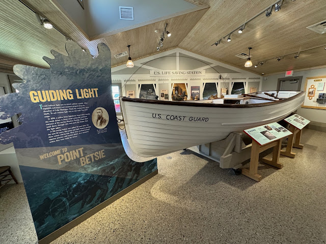 We had wanted to visit Sleeping Bear Dunes National Lakeshore last year when we were in Mackinaw City, but had decided it was going to be too long of a drive. So, we decided when our itinerary got replanned this spring to spend the time getting up to see it. We drove along the back roads toward Empire and stopped at the Point Betsie Lighthouse. It’s not part of the National Lakeshore but is run and maintained by the county. It is a beautiful old light house and rescue station. From the lighthouse, there is a beautiful view of Sleeping Bear Dunes along the sweeping lakeshore. From there, we made our way to the visitor center in Empire. We got our passport stamp, watched the park film, and talked with the Rangers about possible hikes. They gave us a nice suggestion for a short hike that was dog friendly and did not involve climbing any Dunes. After that we drove up to the northern section of the park and did the Peirce Stocking Scenic Drive and enjoyed the views from the top of the dunes out over the lake. We really could not see the outline of a sleeping bear at the top of the dune. Erosion caused by construction in the early 1900s has flattened it out. We then drove on up to Glen Haven, over to Glen Arbor and then up to Pyramid Point. On the way back to Frankfort, we stopped in Glen Haven for dinner.